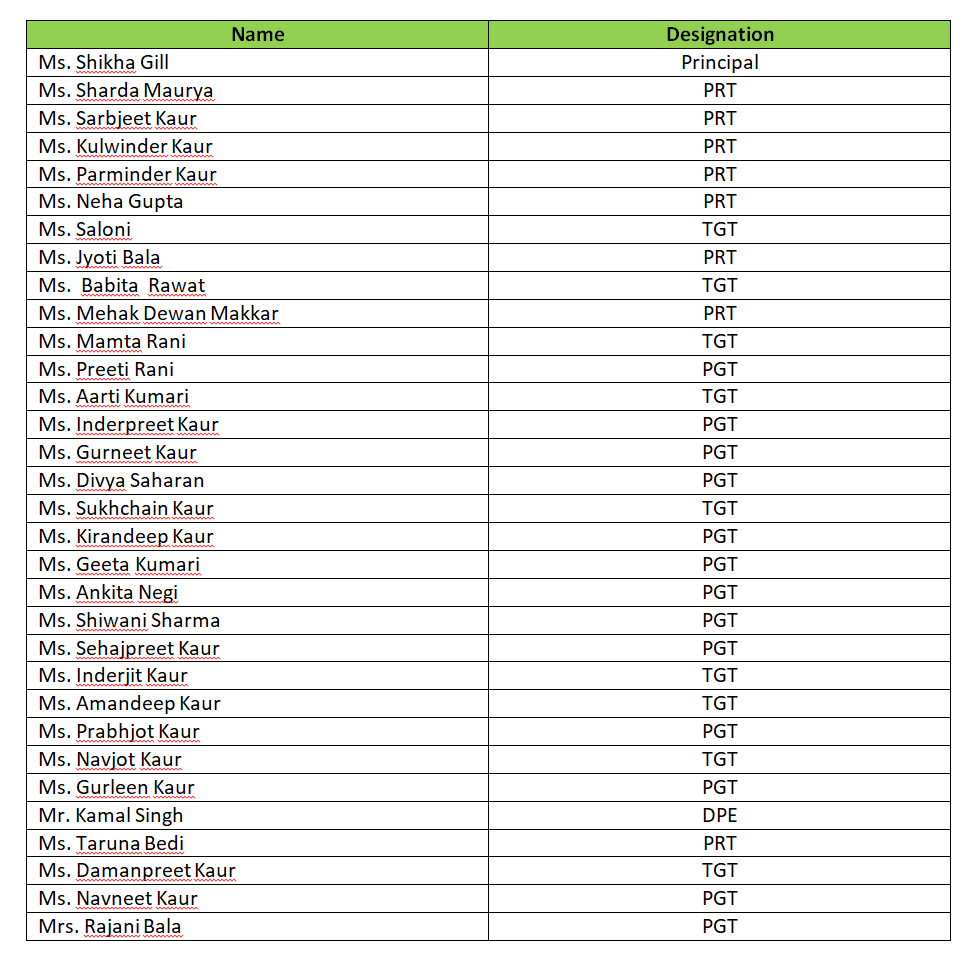 The School has an extremely committed and qualified faculty that constantly strives to make learning pleasurable experience for children and works to realize the potential of each child. The teachers constantly upgrade their professional skills through a multitude of In-house training programmes along with workshops conducted by experts. Workshops and orientation on life’s skills, subject enhancement, effective stress management etc. go a long way in equipping them to strike an admirable balance between home and the workplace and achieve success in both spheres.